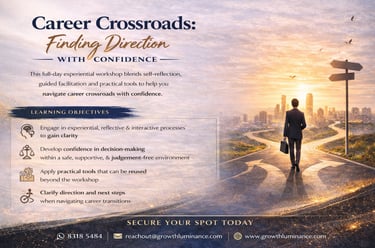 Career Crossroads is a practical, experiential workshop designed for youths and jobseekers who feel uncertain, overwhelmed, or stuck at a crossroads in their career or life direction. Instead of telling you what you should do, this workshop creates a safe, supportive space for you to slow down, reflect, and reconnect with what truly matters to you.